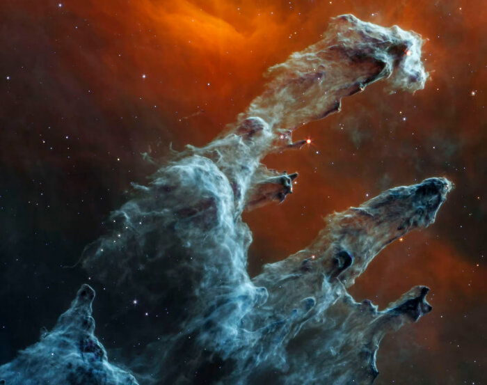 «Столпы Творения» — скопления межзвёздного газа и пыли в туманности Орёл, примерно в 7000 световых лет от Земли. В 2022 году орбитальный телескоп «Джеймс Уэбб» сделал снимки при помощи камер ближнего ИК-диапазона NIRCam и среднего ИК-диапазона MIRI. (Фото NASA; ESA; CSA; STScI; J. DePasquale; A. Pagan):