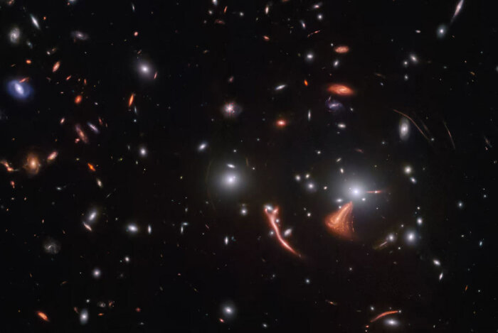Полосы света и яркие дуги выдают присутствие огромной гравитационной линзы на этом изображении, полученном космическим телескопом Джеймса Уэбба. Скопление галактик на переднем плане увеличило далекие галактики, исказив их форму и создав яркие мазки света, разбросанные по всему изображению. Это скопление называется SDSS J1226+2149. (Фото ESA / Webb; NASA / CSA; J. Rigby):