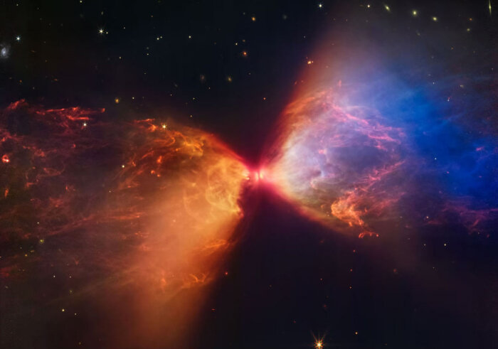Космический телескоп «Джеймс Уэбб» сделал снимок протозвезды L1527, выбросы из которой образуют фигуру, похожую на песочные часы. Она относится к Классу 0 и, предположительно, обладает возрастом всего около 100 тысяч лет. (Фото NASA; ESA; CSA; STScI):
