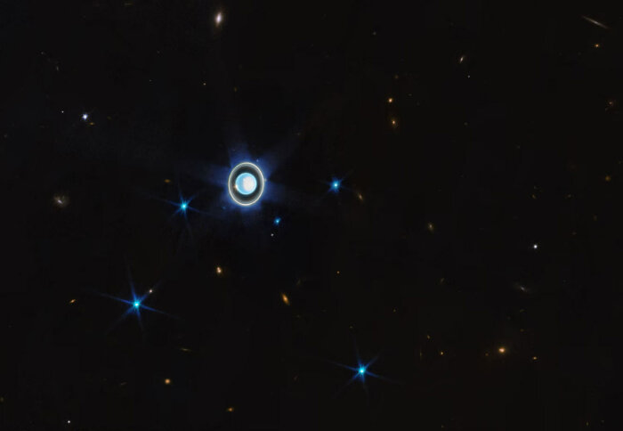 Планета Уран, а также шесть из 27 известных ее спутников. Это самая холодная планетарная атмосфера Солнечной системы с минимальной температурой в 49 К (−224 °C). (Фото NASA; ESA; CSA; STScI; J. DePasquale):