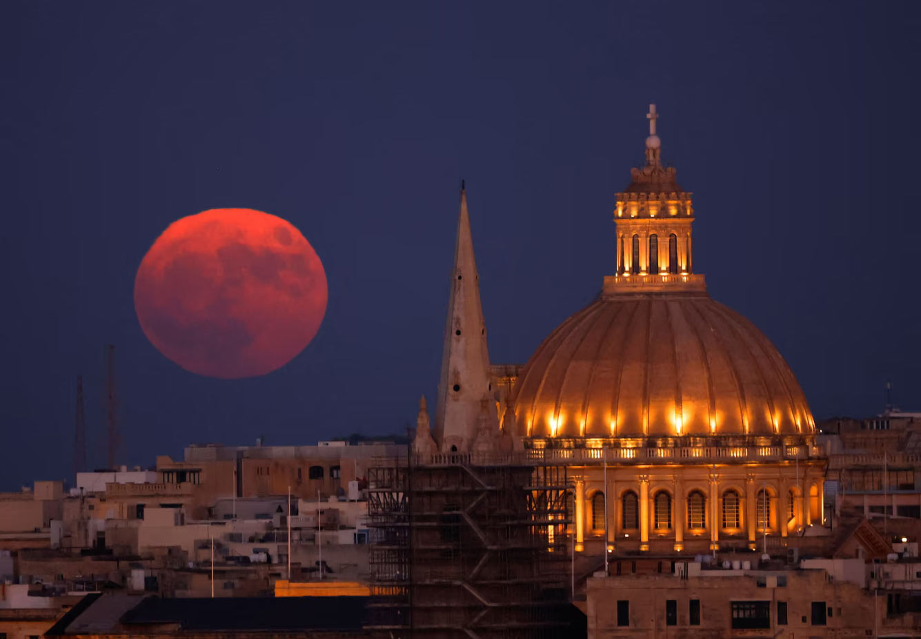 Осетровая луна восходит за шпилем собора Святого Павла и куполом базилики Богоматери на горе Кармель в Валлетте, Мальта. (Фото Darrin Zammit Lupi):