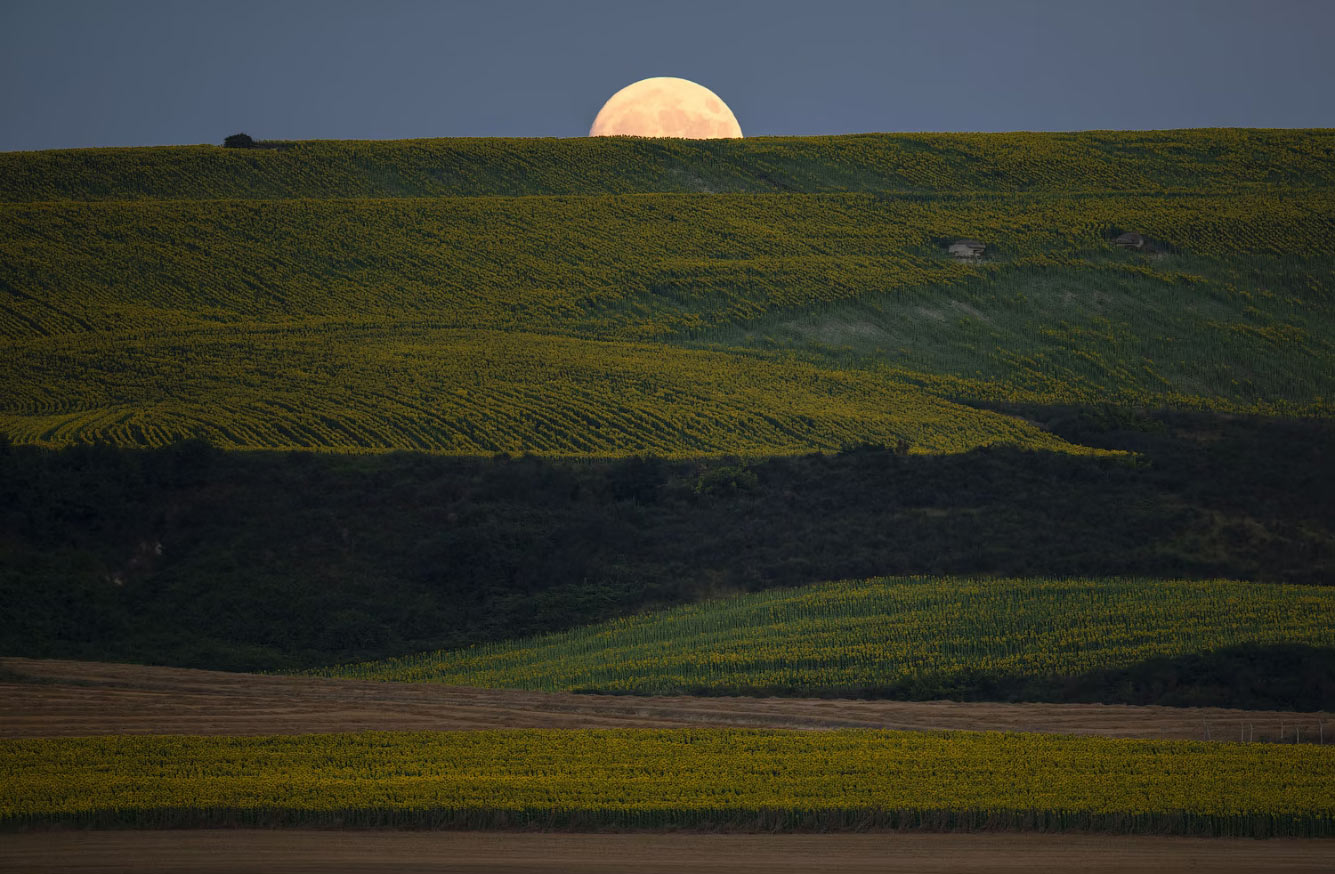 Луна восходит за полем подсолнухов в районе Чаталджа в Стамбуле, Турция. (Фото Isa Terli):
