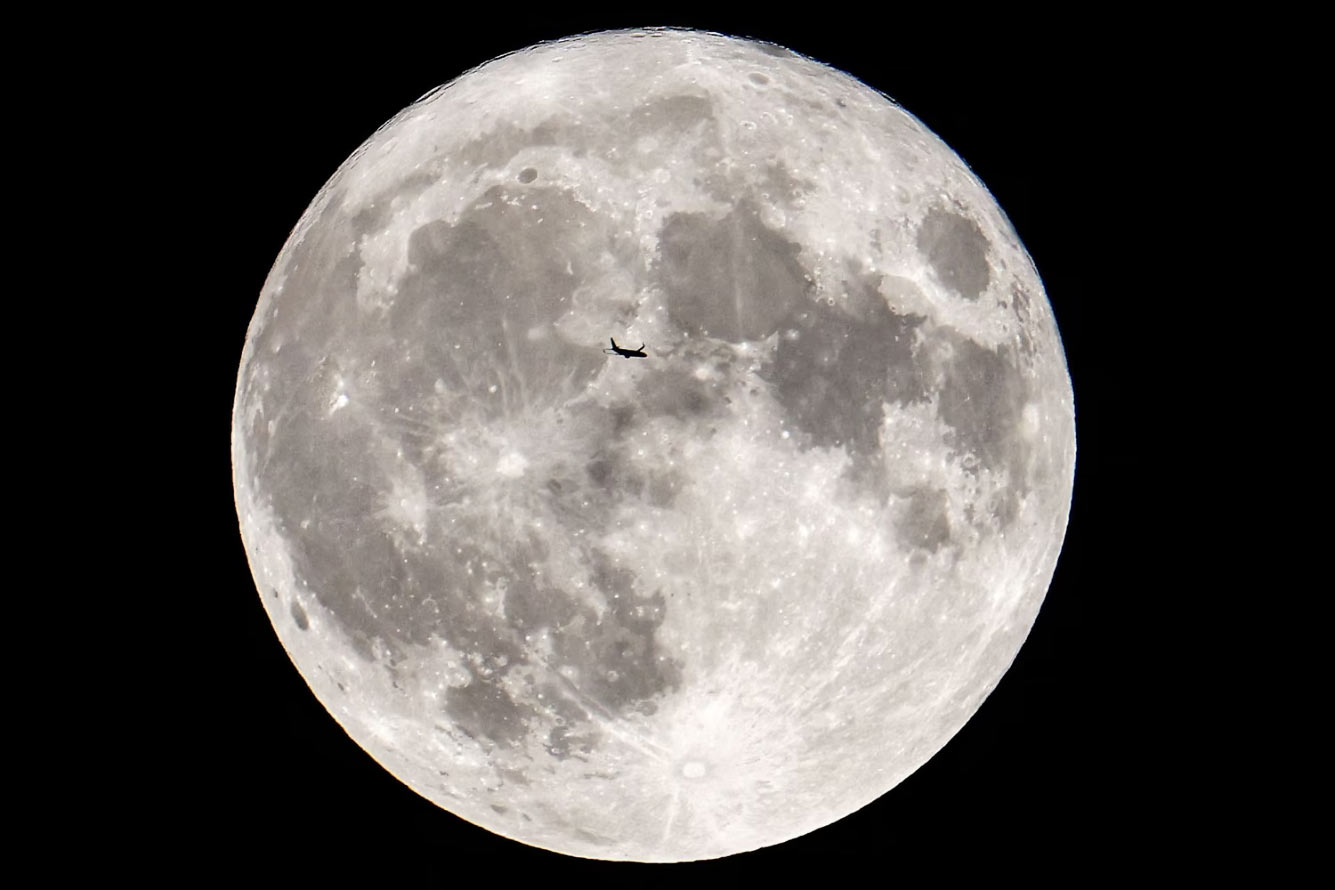 Пассажирский самолет летит перед полной луной, вид из Тулузы, Франция. (Фото Charly Triballeau):