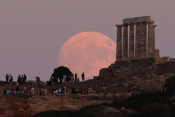 Полная луна восходит над древним храмом Посейдона на мысе Сунион, Греция. (Фото Costas Baltas):