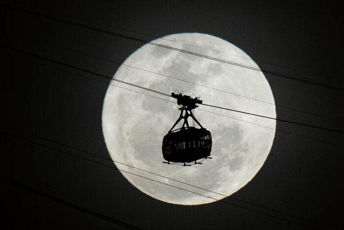 Канатная дорога движется к горе Сахарная голова во время восхода суперлуния в Рио-де-Жанейро, Бразилия. (Фото Silvia Izquierdo):