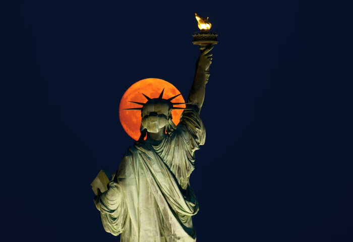 Осетровая луна восходит за Статуей Свободы в Нью-Йорке. (Фото Gary Hershorn):