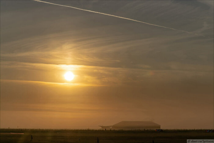 Пилоты и экипаж проверяют оборудование, проводят предполётные проверки и готовятся к взлету. В это время аэродром наполняется шумом двигателей и звуками работы техники. Легкий туман, который окутывает аэродром, создает особую атмосферу. Солнце начинает подниматься из-за горизонта, освещая окрестности ярким светом. Легкий туман рассеивается, и открывается прекрасный вид на окрестности.