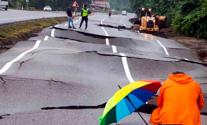 Люди стоят рядом с частично разрушенной дорогой во время наводнения после проливных дождей в Зонгулдаке, Турция. (Фото Dia Images):