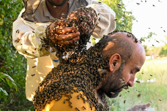 Пчеловод Абдулвахап Семо пытается установить рекорд по ношению на теле пчел , занесенный в Книгу рекордов Гиннеса, в Ване, Турция. Взвешивая вес собранных им пчел на весах, Абдулвахап стремится побить рекорд, установленный в Китае — 63 килограмма. (Фото Ozkan Bilgin):