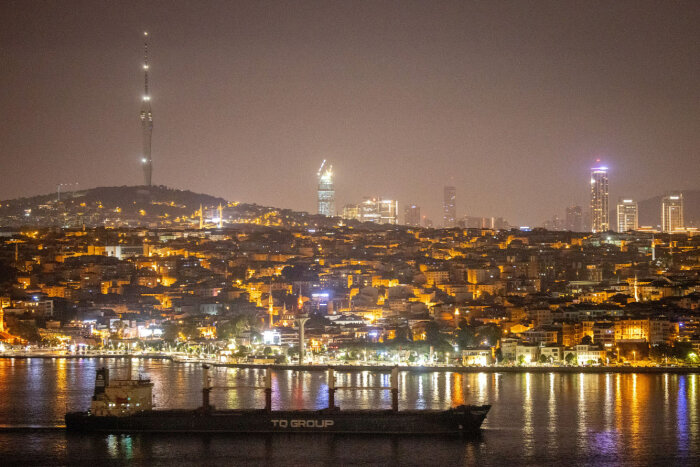 Сухогруз TQ Samsun проходит через пролив Босфор ранним утром 18 июля 2023 года в Стамбуле, Турция. (Фото Chris McGrath):