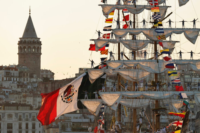 Мексиканский учебный корабль «Куаутемок» проходит мимо Галатской башни в Стамбуле, Турция. (Фото Omer Faruk Yildiz):