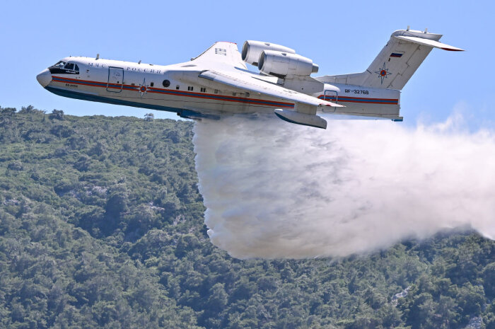 Пожарный самолет сбрасывает воду, чтобы потушить лесной пожар в Измире, Турция. (Фото Mahmut Serdar Alakus):