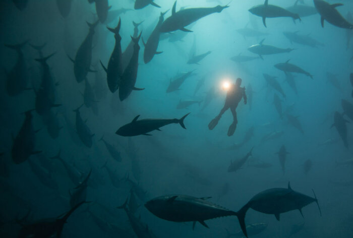 Дайвер плавает с тунцом в Эгейском море в провинции Измир, Турция. (Фото Mahmut Serdar Alakus):