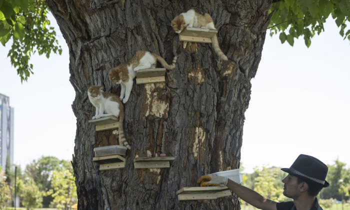 Мужчина кормит котят, живущих на дереве в парке Сапара Мурата Туркменбаши в Кечиоренском районе Анкары, Турция. (Фото Osmancan Gurdogan):