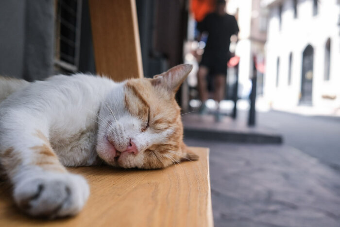 Турция – страна кошек. Бездомный кот спит на столике в кафе в Стамбуле, Турция. (Фото Sedat Suna):