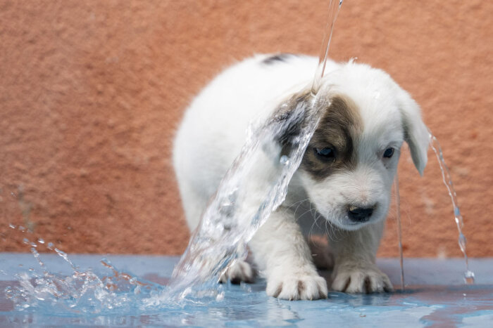 1,5-месячного щенка по кличке Памук поливает его владелец, чтобы он спасся от сильной жары в Конье, Турция. (Фото Mustafa Ciftci):