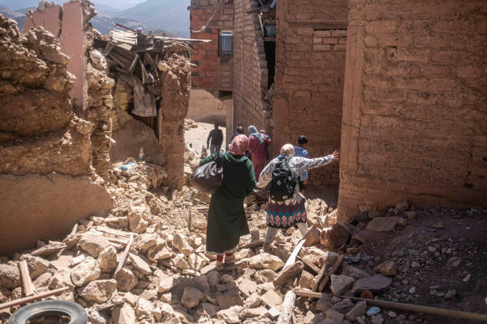 Жители покидают свои дома после землетрясения в деревне Мулай Брахим, недалеко от эпицентра землетрясения, 9 сентября 2023. (Фото Mosa’ab Elshamy):