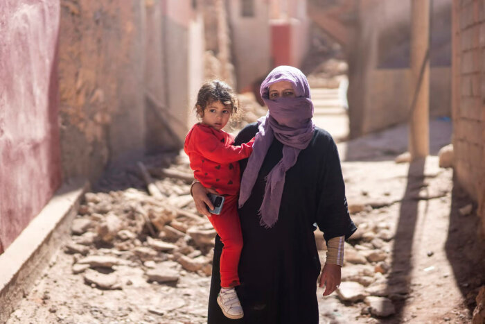 Женщина и ее дочь стоят возле своего дома после землетрясения в деревне Мулай Брахим. (Фото Mosa’ab Elshamy):