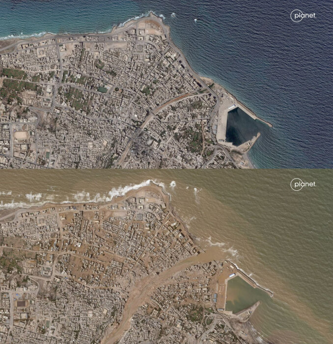 Пара спутниковых снимков «до» и «после» показывает город Дерна, Ливия до наводнения и после. (Фото Planet Labs PBC):