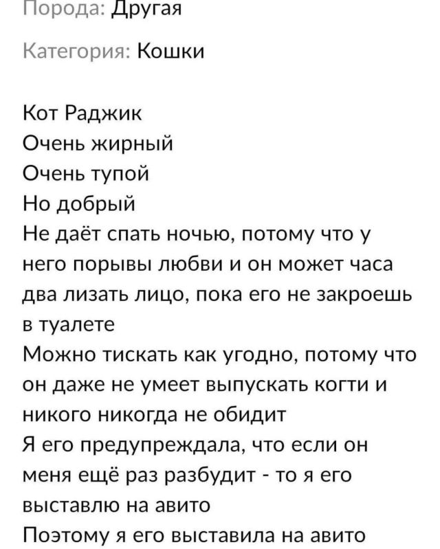 Тупой, жирный и очень ласковый. Пожалуй, это самый замечательный набор качеств для идеального котика. Но где же такого найти? Возрадуйтесь, питомец мечты существует, но стоит аж... миллион рублей. Этого красавчика зовут Раджик. Да, ценник, вероятно, немного завышен. Но разве можно жадничать, когда речь идет о таком прекрасном котике? Надо брать.