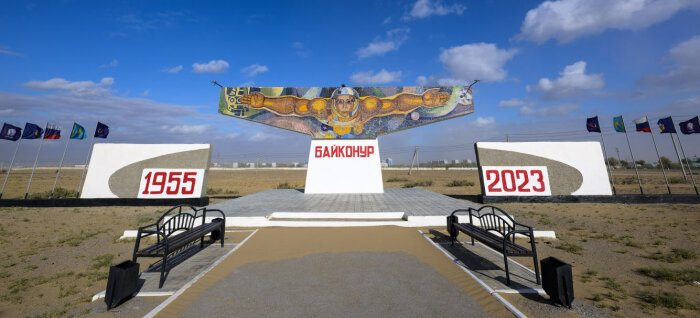 Мозаичный знак приветствует посетителей возле города Байконур, Казахстан. (Фото NASA/Bill Ingalls):