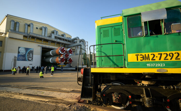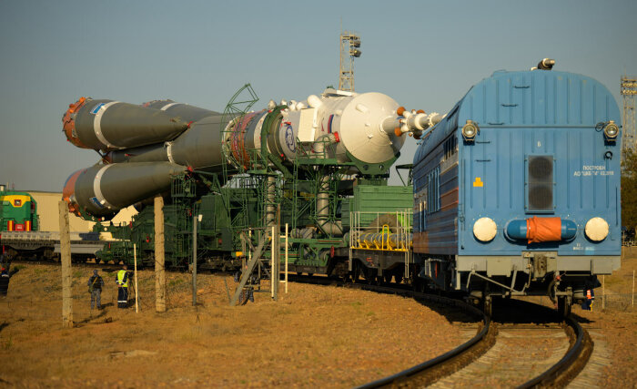 Ракета «Союз» вывозится поездом на стартовую площадку, 12 сентября 2023. (Фото NASA/Bill Ingalls):