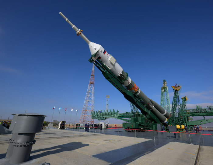 Следующий этап — подъем ракеты в вертикальное положение на стартовой площадке Байконура. (Фото NASA/Bill Ingalls):