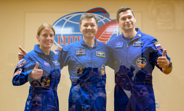 Космонавты «Роскосмоса» Олег Кононенко, Николай Чуб и астронавт NASA Лорал О’Хара. (Фото NASA/Bill Ingalls):