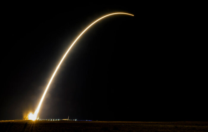 Всего минута, и «Союз» уже скрывается в небе. Через 117 секунд отработала первая ступень. С 1967 года это была 192-я стыковка с МКС. (Фото NASA/Bill Ingalls):