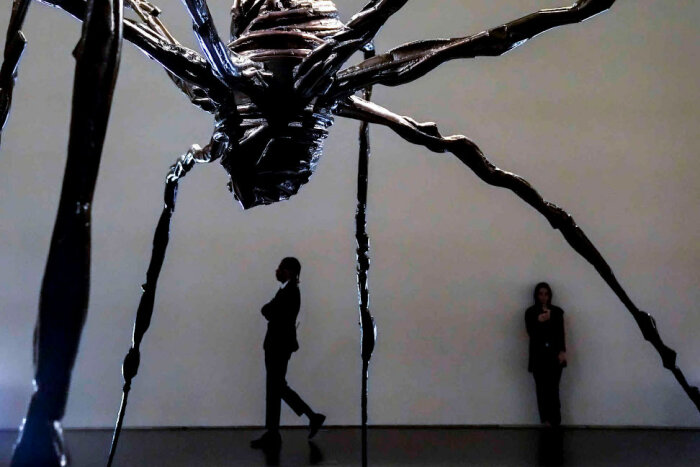 Стальная скульптура Луизы Буржуа «Паук». Или «Мама». В 2000 году Лондонская галерея Тейт открыла Турбинный зал как пространство для выставок произведений современного искусства особо крупного масштаба, Буржуа пригласили создать для них инаугурационную инсталляцию. Ключевым элементом выставки скульптора стало возведение гигантского стального паука под названием Maman, возвыщающегося более чем на десять метров на восьми веретенообразных ногах, вокруг которых предлагалось побродить зрителям. (Фото Bebeto Matthews):
