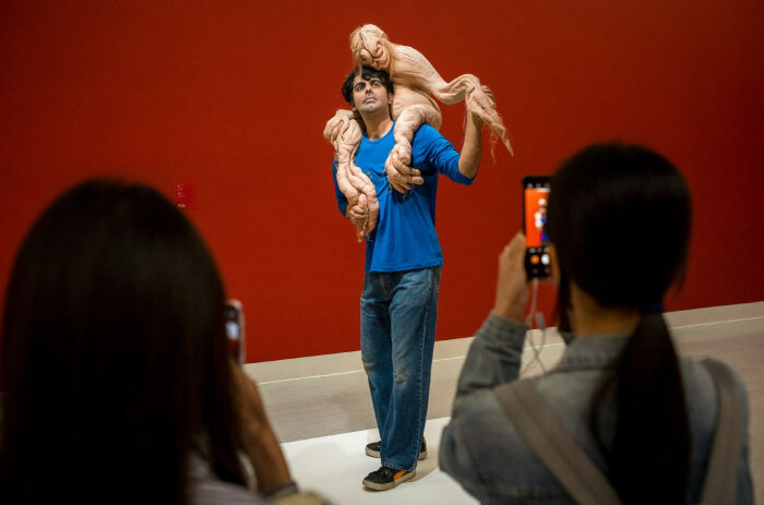 Люди смотрят на скульптуру Патрисии Пиччинини «Саженец» во время выставки «Сверхъестественное: Скульптурное видение тела» в Тайбэе, Тайвань. (Фото Wiktor Dabkowski):