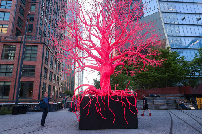 «Старое дерево» швейцарской художницы Памелы Розенкранц. Ярко-красновато-розовая скульптура дерева, выполненная из стали и полимера,Нью-Йорк. (Фото Selcuk Acar):