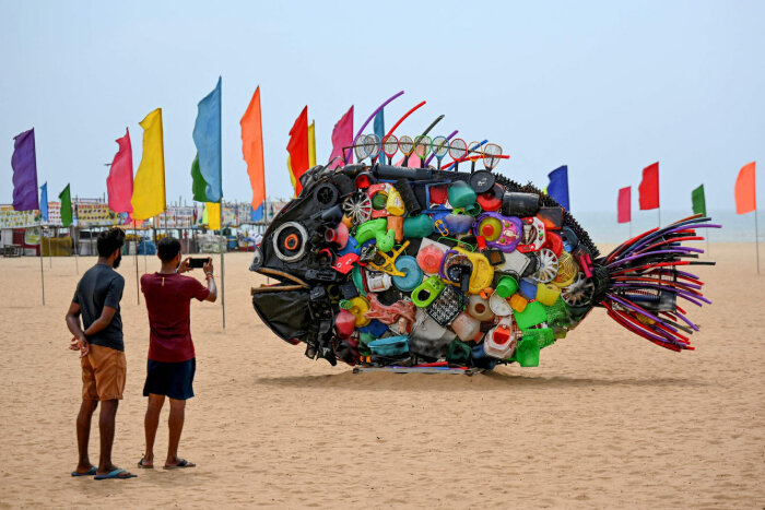 Люди фотографируют инсталляцию с изображением рыбы, сделанную из пластиковых отходов, выставленную на пляже Эдварда Эллиота. (Фото R. Satish Babu):