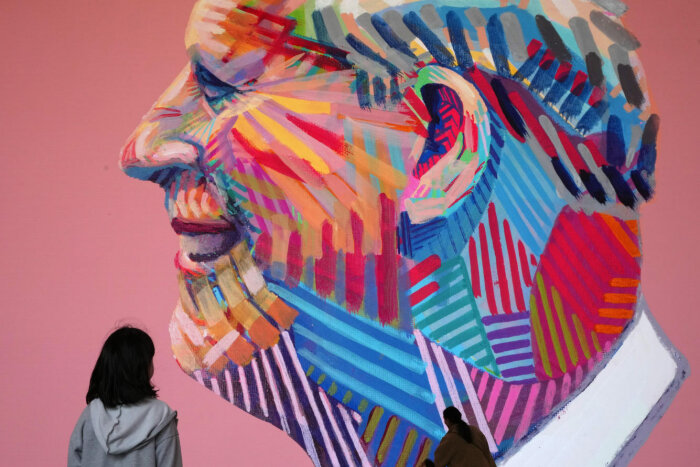 «Королевский большой портрет», гигантский цифровой портрет британского короля Карла III, включающий сотни тысяч отдельных портретов короля, нарисованных людьми со всей Великобритании, выставлен в Outernet в Лондоне. (Фото Kirsty Wigglesworth):