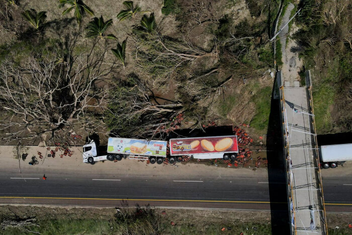 Перевернутый полуприцеп лежит на обочине шоссе на окраине Акапулько, Мексика, 27 октября 2023. (Фото Felix Marquez):
