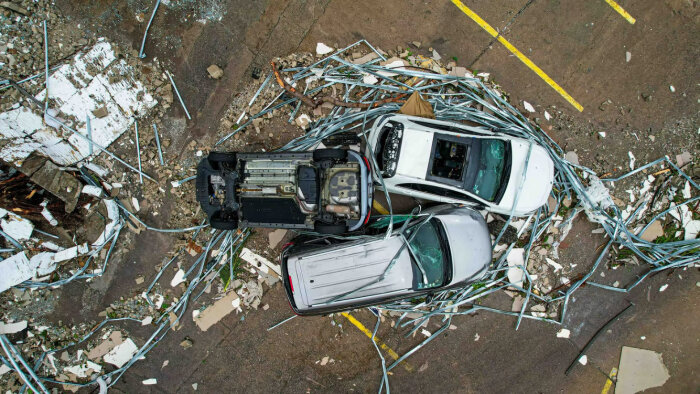 Машины и мусор, разбросанные штормовым ветром и наводнением, лежат на улице. (Фото Francisco Robles):