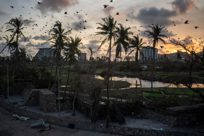 Птицы летают над обломками и обломками урагана в Акапулько. (Фото Felix Marquez):