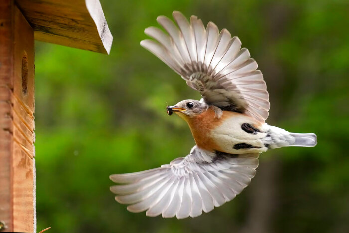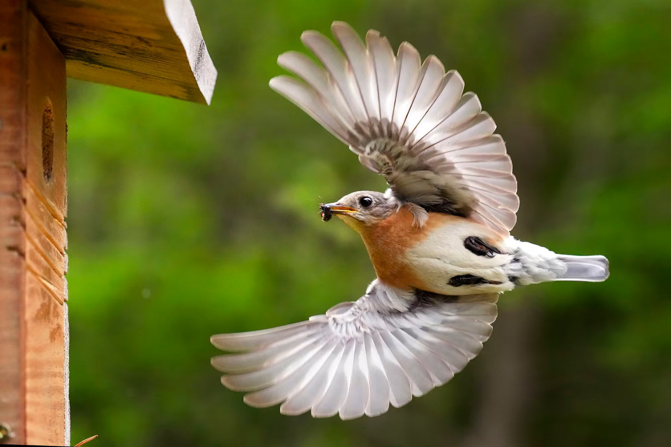 Самка восточной синей птицы возвращается в свой скворечник с насекомым для своих птенцов во Фрипорте, штат Мэн. (Фото Robert F. Bukaty):