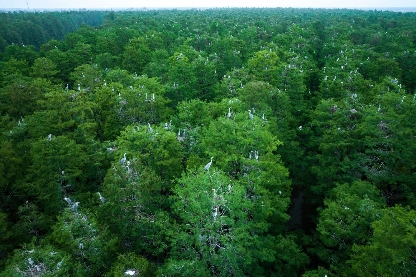 На его аэрофотоснимке видны десятки цапель, отдыхающих на деревьях в болотном парке в Тайчжоу, восточная китайская провинция Цзянсу:
