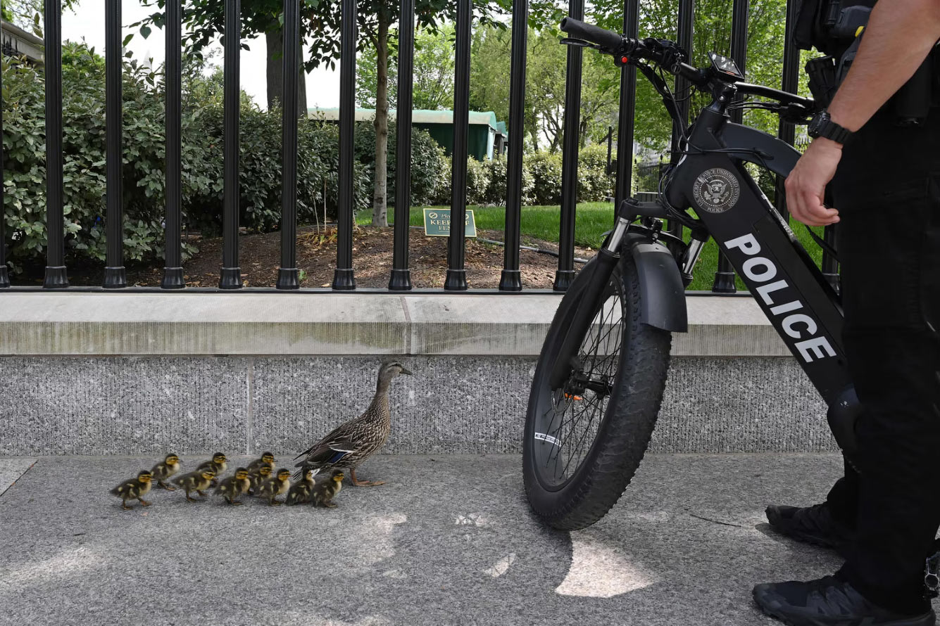 Офицер подразделения Секретной службы США в форме наблюдает за семейством уток, гуляющих по тротуару Пенсильвания-авеню перед Белым домом в Вашингтоне. (Фото Mandel Ngan):