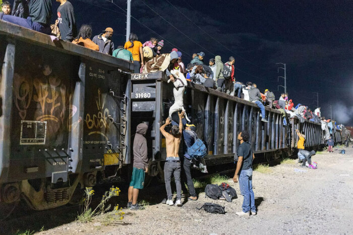 Мигранты и собака садятся на поезд в пустыне Чиуауа в Мексике. (Фото David Peinado / Anadolu Agency):