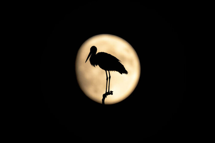 Аист сидит на ветке дерева во время восхода луны возле плотины Хамзабей в Бурсе, Турция. (Фото Alper Tuydes):