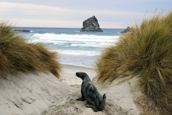 Морской лев идет по пляжу в заливе Сэндфлай на полуострове Отаго, недалеко от Данидина, Новая Зеландия. (Фото Alessandra Tarantino):