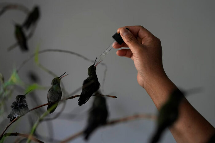 Сесилия Сантос кормит колибри с помощью пипетки в доме Кати Латтуф, которая превратила свою квартиру в клинику для крошечных птиц, Мехико. (Фото Fernando Llano):