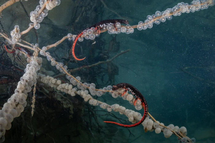 Самки северных очковых саламандр откладывают яйца на погруженные в воду ветки в холодных водах Апеннинского ручья в итальянском национальном парке Форесте Казентинези. (Фото Fabio Savini/Siena Awards 2023):
