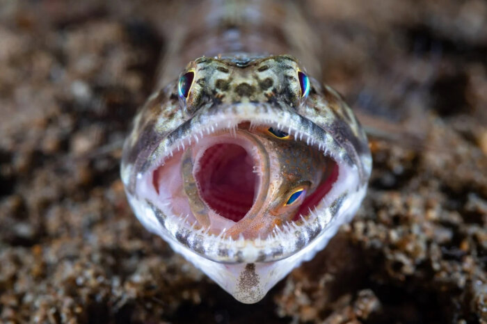 Молодого окуня почти целиком проглотила рыба-ящерица, но с невероятными усилиями ему удалось вырваться на свободу и спастись всего через несколько секунд после того, как была сделана фотография. (Фото Lilian Koh/Siena Awards 2023):