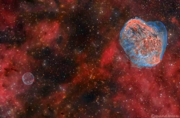 Когда звезды умирают, они создают облака. Два звездных облака смерти из газа и пыли можно обнаружить в направлении высоко летящего созвездия Лебедя (Лебедь). NGC 6888 (другое обозначение — LBN 203) — эмиссионная туманность в созвездии Лебедь. Размеры туманности составляют примерно 25 на 18 световых лет. Она располагается на расстоянии примерно 4700 световых лет от Земли. (Фото Abdullah Al-Harbi):