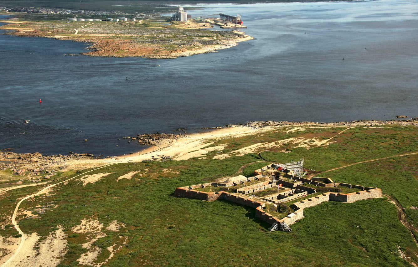 Вид с воздуха на национальный исторический памятник «Форт принца Уэльского» через реку Черчилль из Черчилля, Манитоба, Канада. Первоначально форт представлял собой деревянное строение, построенное компанией Гудзонова залива в 1717 году. (Фото Michael Poliza):