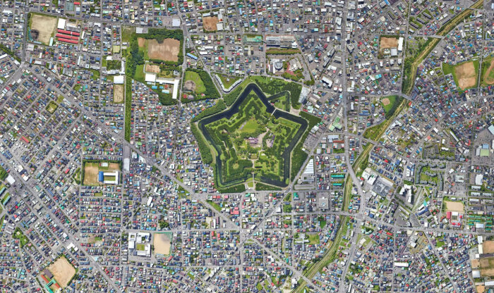 Спутниковый снимок форта Горёкаку в Хакодате, Япония, сделанный в Google Earth. Крепость была построена сёгунатом Токугава в 1866 году. Сегодня на этом месте находится городской парк . (Фото © Google, Inc.):