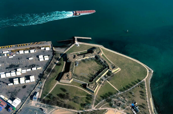 Обзор с высоты национального памятника и исторического храма Форт МакГенри в Балтиморе, штат Мэриленд. Первоначально построенный в 1798 году, его бомбардировка британскими войсками во время битвы при Балтиморе в 1814 году вдохновила Фрэнсиса Скотта Ки написать слова к песне, которая стала национальным гимном США. (Фото Greg Pease):